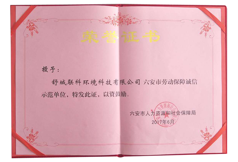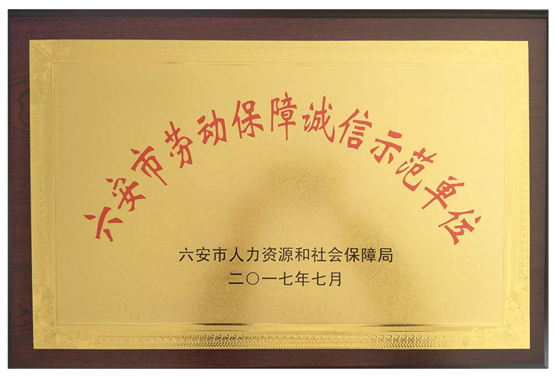 2017年7月,我公司被六安市人力資源和社會保障局授予“六安市勞動保障誠信示范單位”稱號。